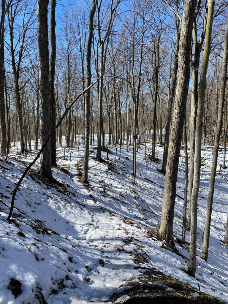 Then as you start to suddenly approach a downhill, I often like to slow significantly as I see the downhill and gauge my best route for approaching. Walking the downhills and grabbing onto trees for support will be a major help. BUT I have another fun trick for managing the downhills safely. The safest way to do a downhill on icy terrain is to AVOID that downhill and change course. If it’s steeper than a 70-degree angle, it’s time to remember that you’re not the world’s best downhill skier, nor are you wearing skis.