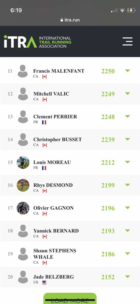 In Canada, the majority of ‘ITRA National League’ races are in Quebec. The ones currently listed for 2025 include the Squamish 50K, four Quebec races, and one lonely Maritimes race. Therefore, when I opened the email, I already knew where the ranking would be skewed.