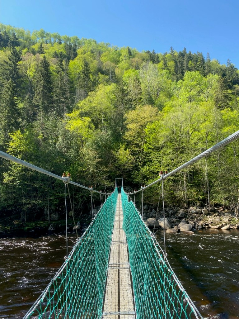 I stayed with Louis and a pack of others that included Sergio Raez-Villanueva, as we hit the swaying swinging bridges. Louis led us out across the bridges and because they were hanging at a wobbly shoulder height, I momentarily tried to see what it would be like to bend down and run lower to the ground. It worked well so I shouted out for Louis to do the same as the other guys behind me followed suit.