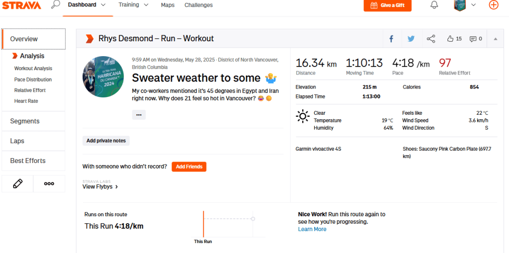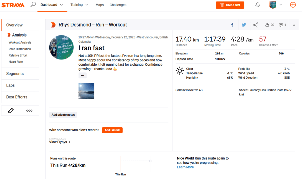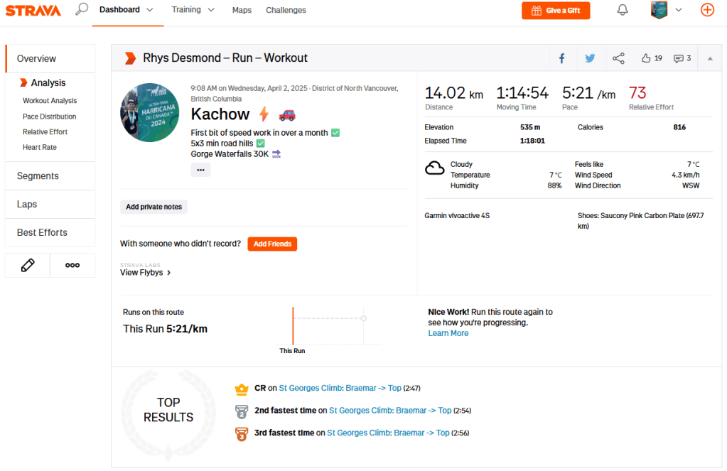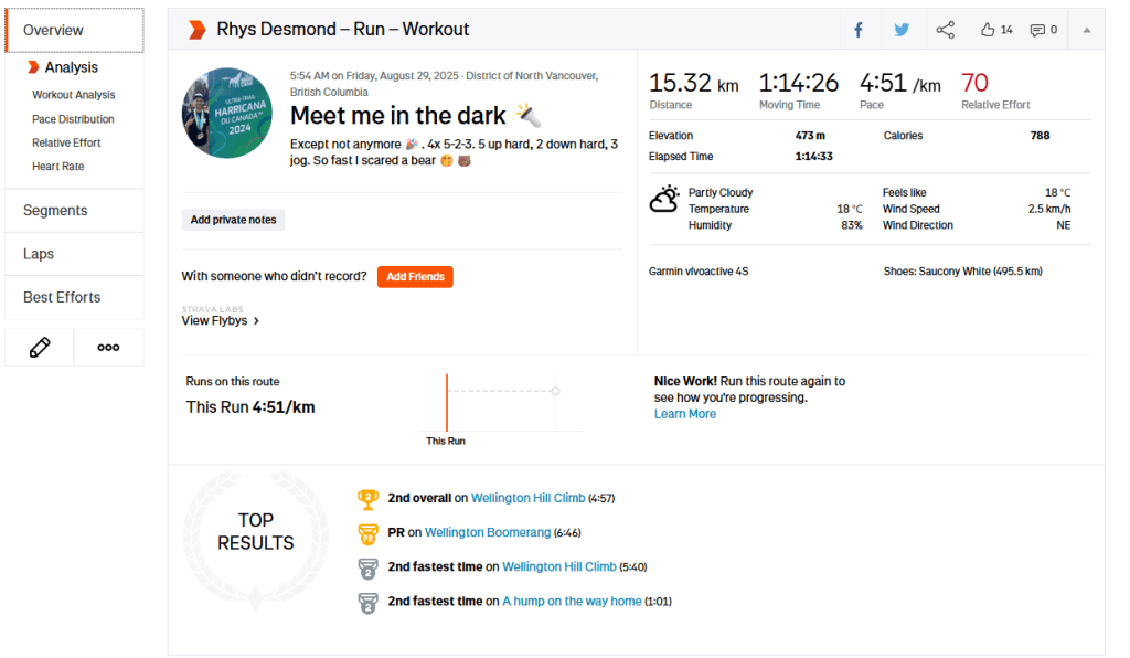 I did this workout on a section of the Spirit Trail in North Van, which also ended up being a great little spot to a short loop like this. That definitely helped. I also think both this workout and the last one were aided by being surrounded by people. Maybe I feel cool when people are watching?