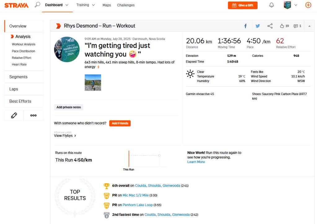 This workout had it all! It was my first time doing a workout in Halifax on my vacation with my girlfriend, and everything lucked out so perfectly with the hill I chose for the 3-minuters. It ended up featuring a really steep section I could use for the 1-minuters, and then had a park nearby for the 8-minute tempo.